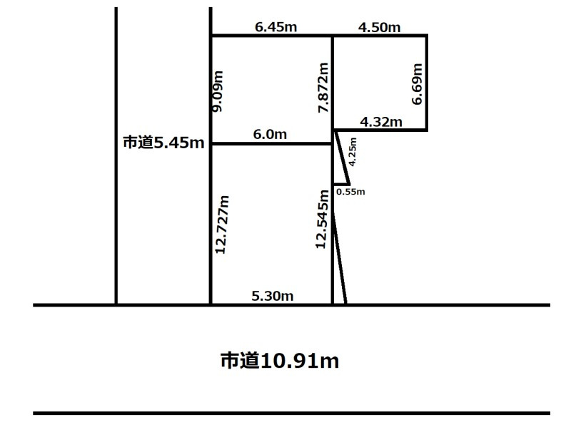 | 接道状況 | 角地 (西側 公道10.9m 間口5.3m) (北側 公道5.4m 間口21.8m) | ||